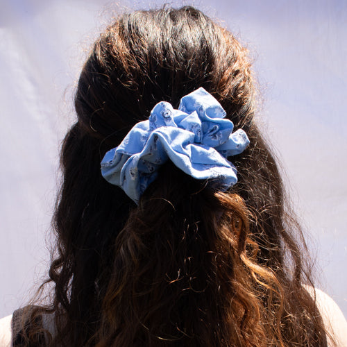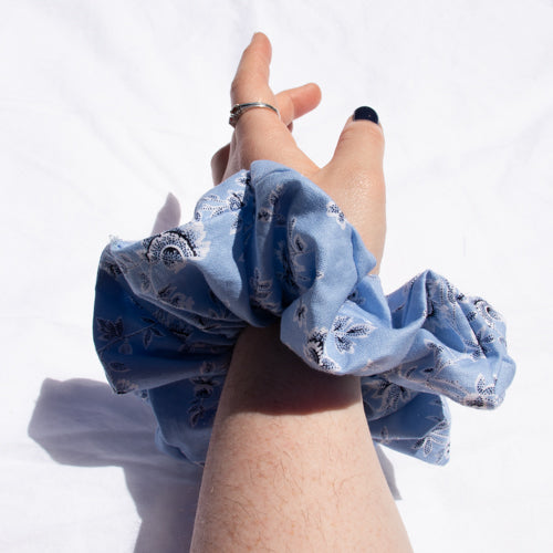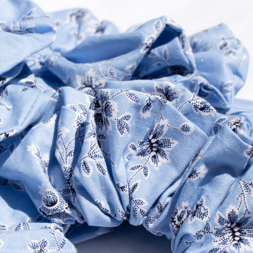 The baby blue florals of the Grace scrunchie are just a gorgeous addition to any outfit.